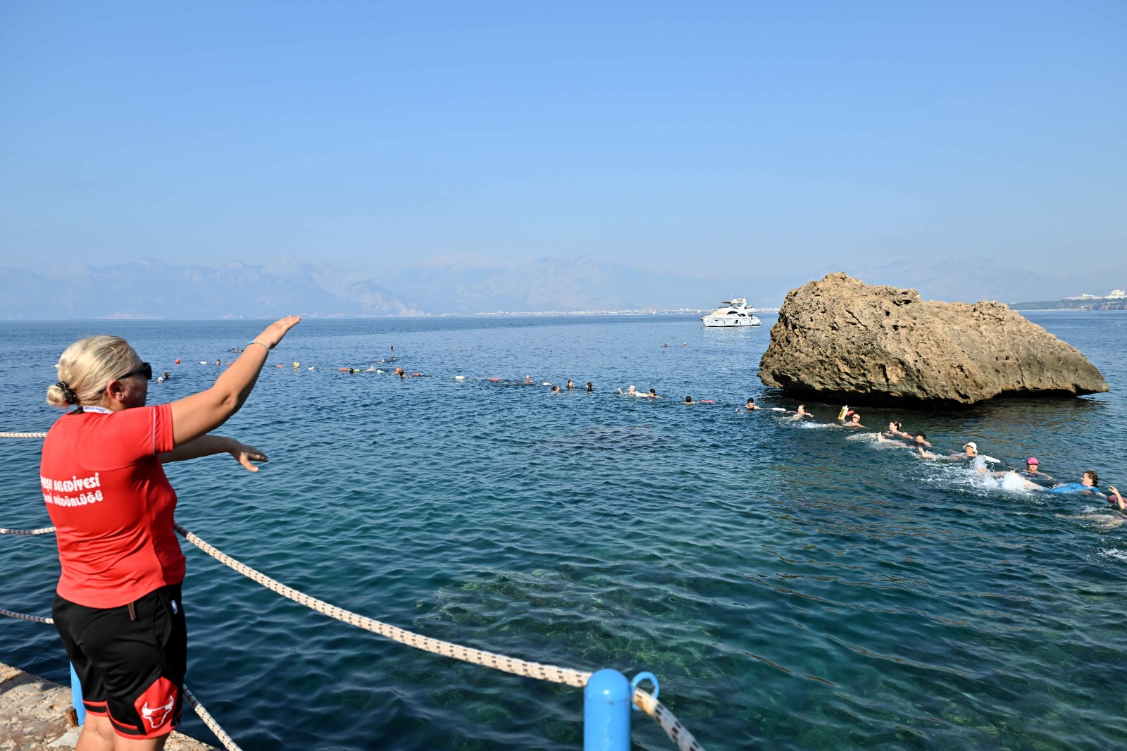 Antalya’da Muratpaşa Belediyesi’nin falez sahil bandında yer alan mavi bayraklı Erenkuş plajında haftada üç gün düzenlenen su cimnastiği kursu yoğun ilgiyle gerçekleşiyor.