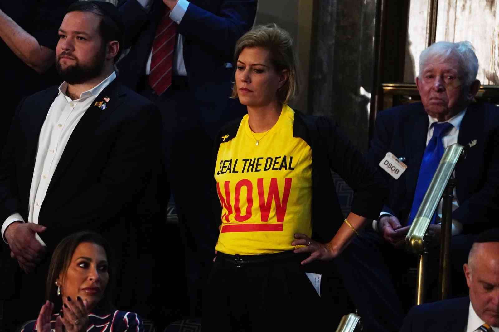 ABD Kongresi’nde onlarca Demokrat Partili Kongre üyesi, Tel Aviv yönetiminin Gazze’de binlerce sivilin ölümü ve ortaya çıkarılan insani kriz nedeniyle Netanyahu’nun konuşmasını boykot etti. Temsilciler Meclisinin Müslüman kadın üyesi Rashida Tlaib’in ise kefiye taktığı ve İsrail başbakanının konuşması sırasında “Soykırım Suçlusu” yazılı döviz taşıdığı görüldü. Bir katılımcının ise İsrailli esirlerin serbest bırakılması için Hamas ile anlaşma yapılması çağrısında bulunan “Anlaşmayı şimdi yapın” yazılı sarı bir tişört giydiği görüldü. Konuşma sırasında Demokrat Parti’nin başkan adayı Başkan Yardımcısı Kamala Harris’in salonda bulunmaması dikkat çekti.