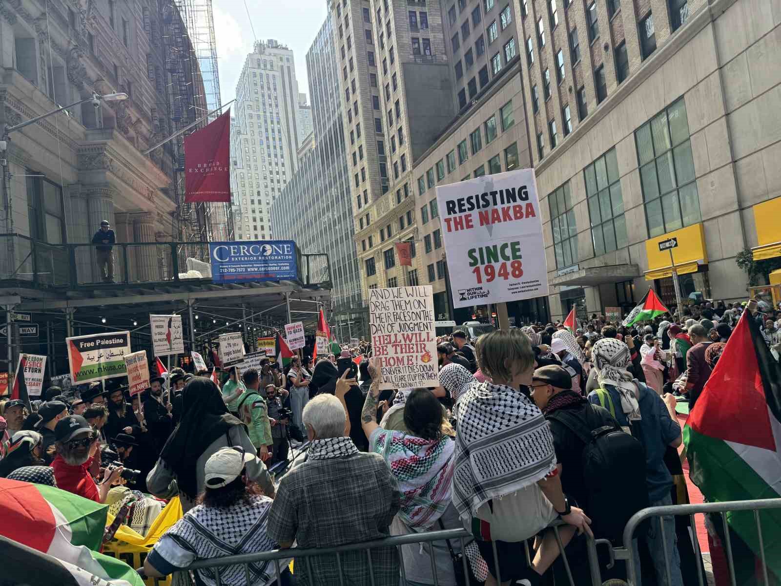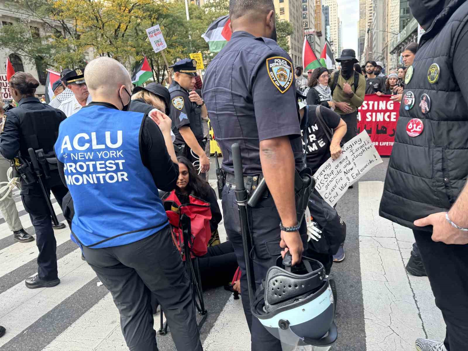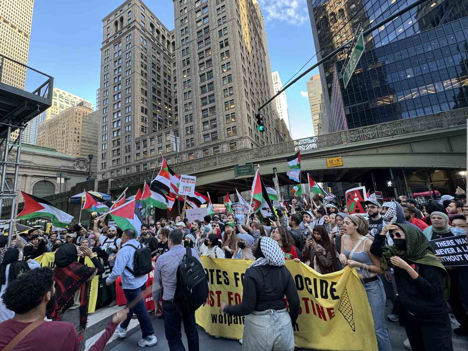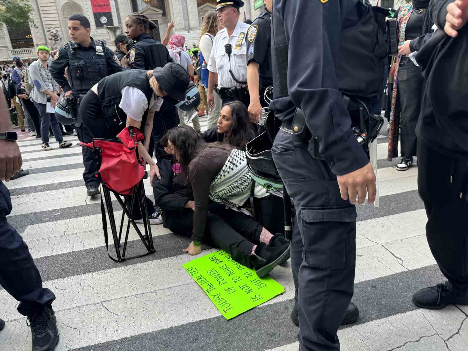 Protesto, New York’un sembolik noktalarından biri olan Wall Street’teki New York Borsası önünde başladı ve Manhattan boyunca birçok önemli noktaya yayıldı. Göstericiler, “Özgür Filistin, Özgür Gazze” ve “Söyle İsrail bugün kaç çocuk öldürdün?” gibi sloganlarla İsrail’in eylemlerini kınarken, aynı eleştiriyi ABD yönetimine de yönelterek, “Söyle Amerika bugün kaç çocuk öldürdün?” sloganlarıyla ABD Başkanı Joe Biden’ın politikalarına tepki gösterdiler. Gösteri boyunca polis ve göstericiler arasında zaman zaman gergin anlar yaşandı. Polisin sert müdahalesi sırasında bazı göstericilerin darbe aldıkları görüldü ve çok sayıda gözaltı gerçekleştirildi. Gözaltılar sırasında yaşanan arbede, protestocuların öfkesini artırdı ve olaylar kontrolden çıkmadan önce güvenlik güçleri durumu stabilize etmek için yoğun çaba sarf etti. Protestoyu izlemek için iki polis helikopteri ve bir polis dronu da kullanıldı.