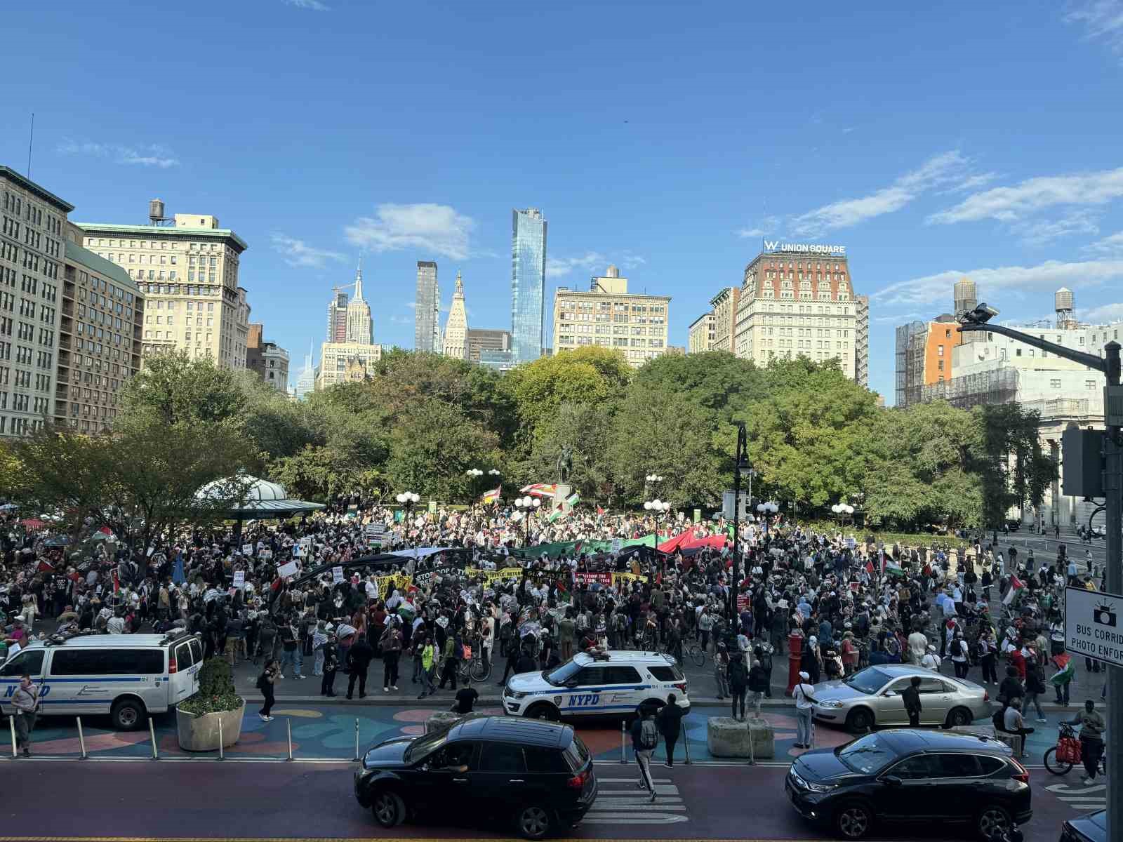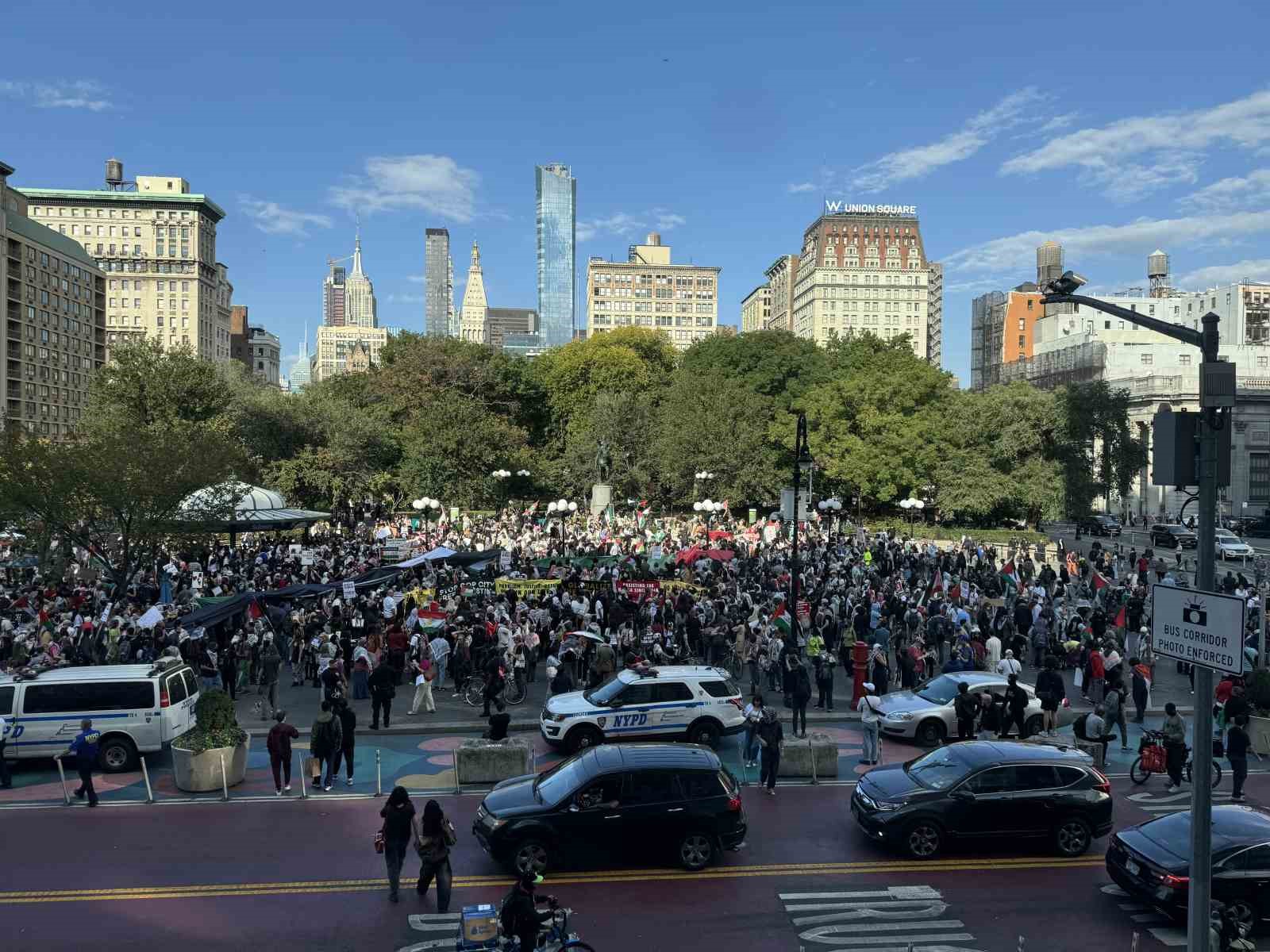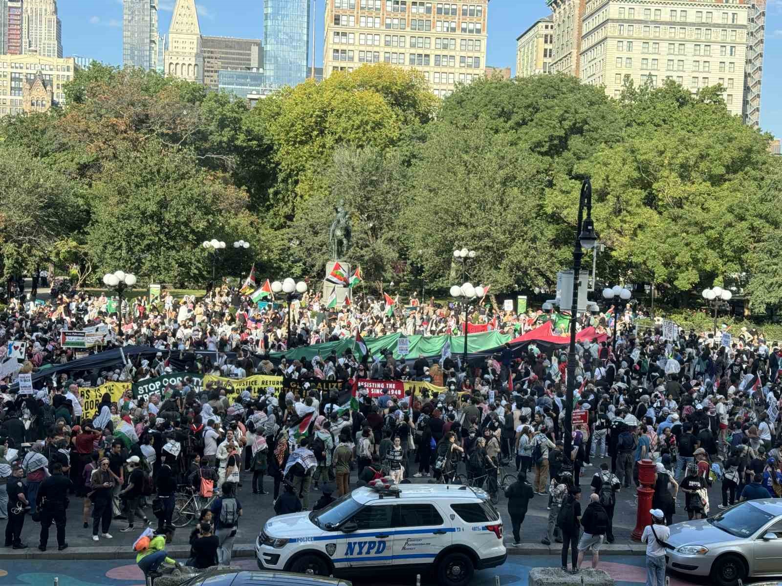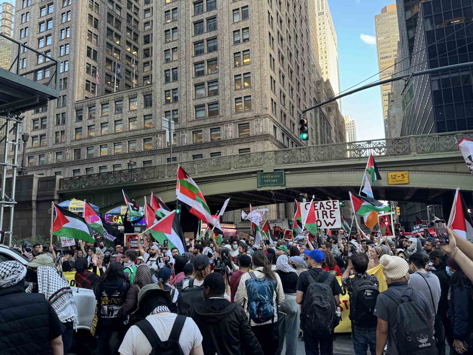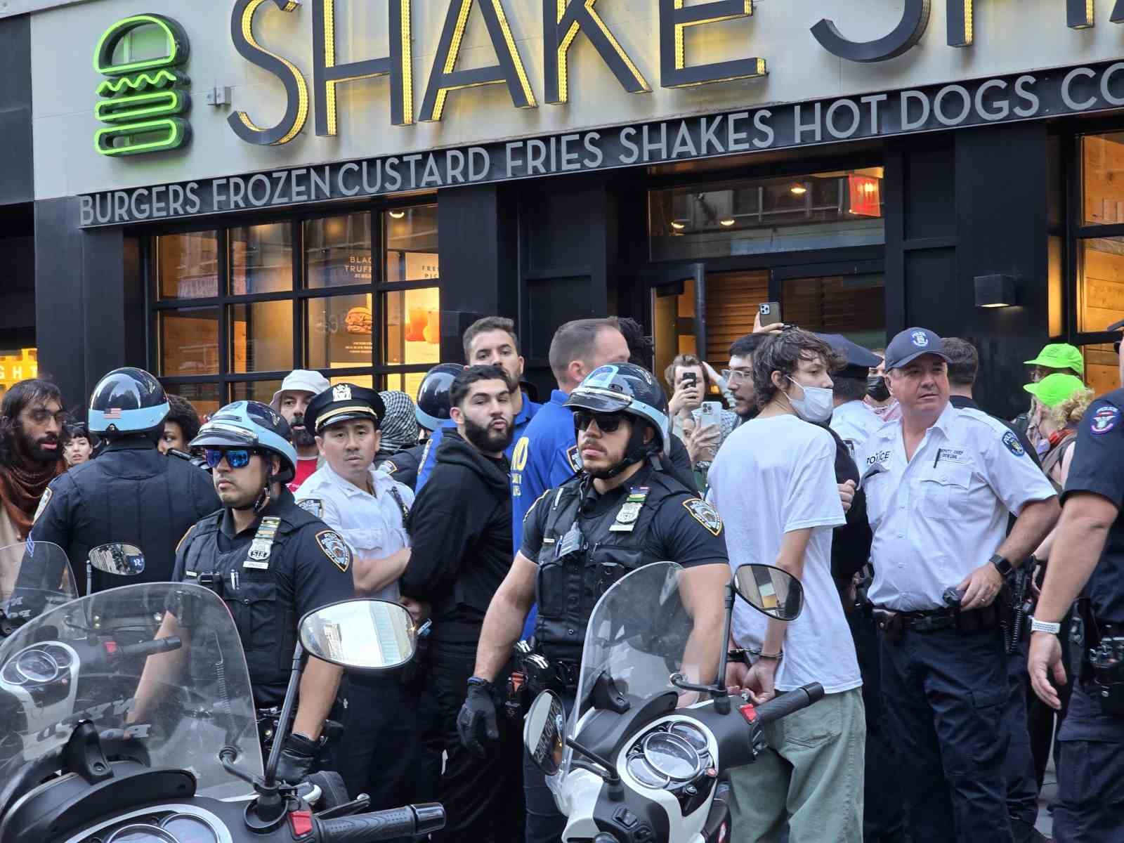 Protesto, New York’un sembolik noktalarından biri olan Wall Street’teki New York Borsası önünde başladı ve Manhattan boyunca birçok önemli noktaya yayıldı. Göstericiler, “Özgür Filistin, Özgür Gazze” ve “Söyle İsrail bugün kaç çocuk öldürdün?” gibi sloganlarla İsrail’in eylemlerini kınarken, aynı eleştiriyi ABD yönetimine de yönelterek, “Söyle Amerika bugün kaç çocuk öldürdün?” sloganlarıyla ABD Başkanı Joe Biden’ın politikalarına tepki gösterdiler. Gösteri boyunca polis ve göstericiler arasında zaman zaman gergin anlar yaşandı. Polisin sert müdahalesi sırasında bazı göstericilerin darbe aldıkları görüldü ve çok sayıda gözaltı gerçekleştirildi. Gözaltılar sırasında yaşanan arbede, protestocuların öfkesini artırdı ve olaylar kontrolden çıkmadan önce güvenlik güçleri durumu stabilize etmek için yoğun çaba sarf etti. Protestoyu izlemek için iki polis helikopteri ve bir polis dronu da kullanıldı.