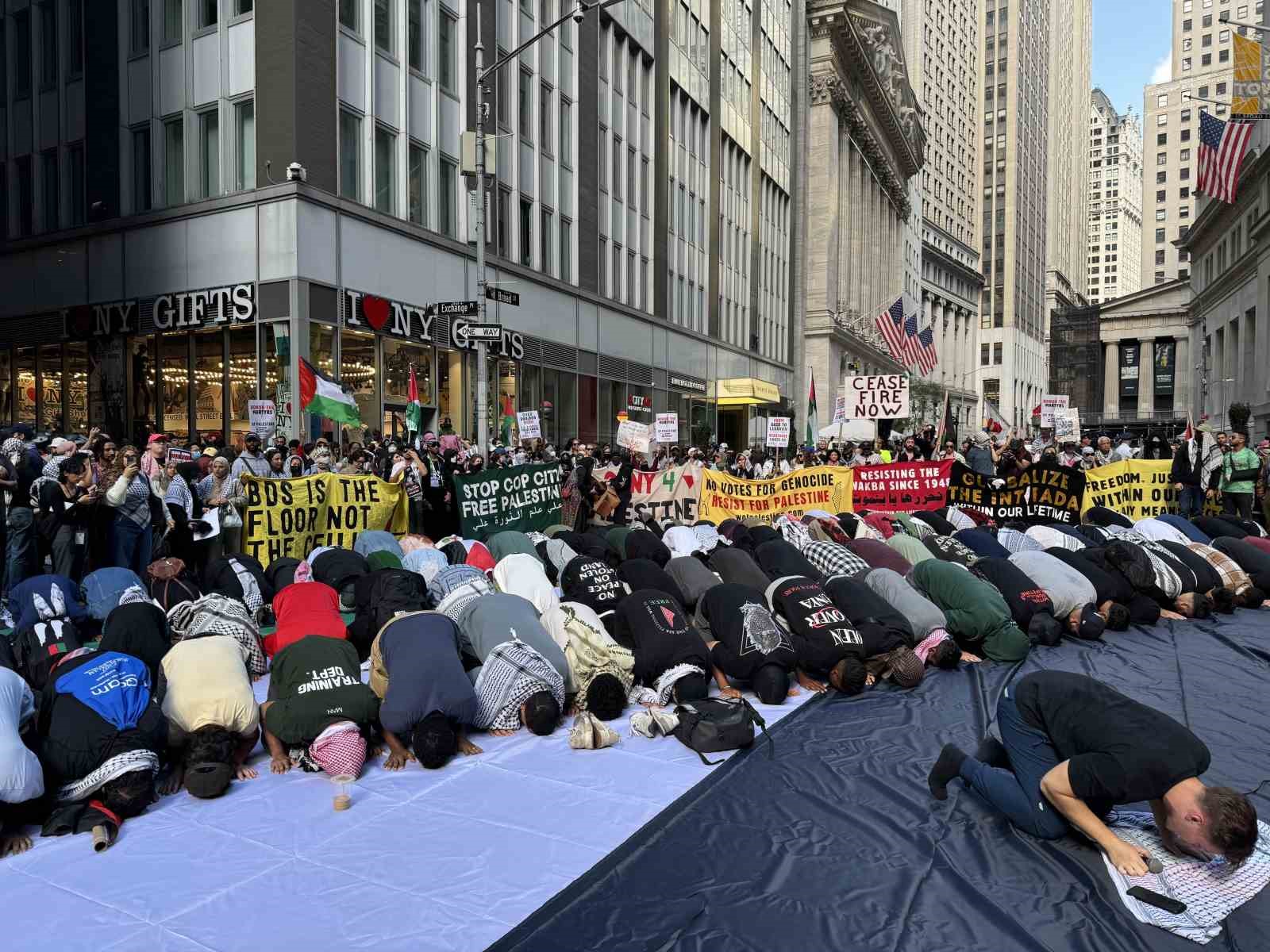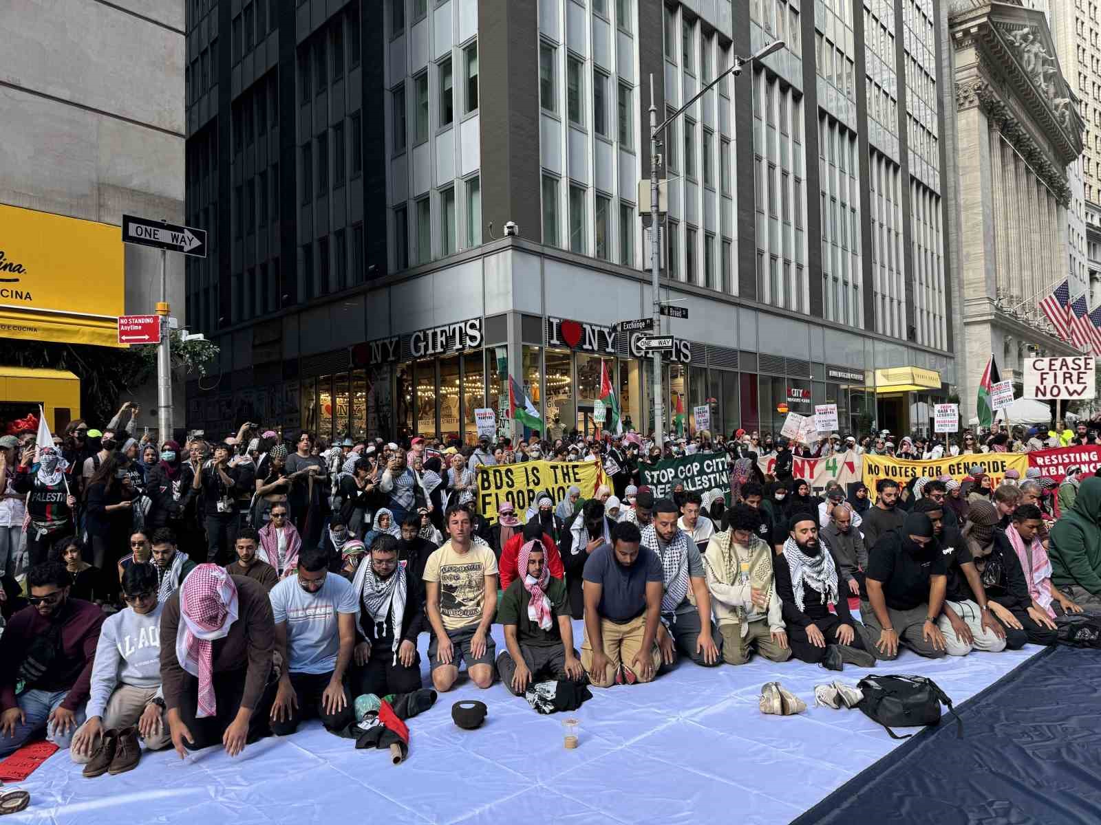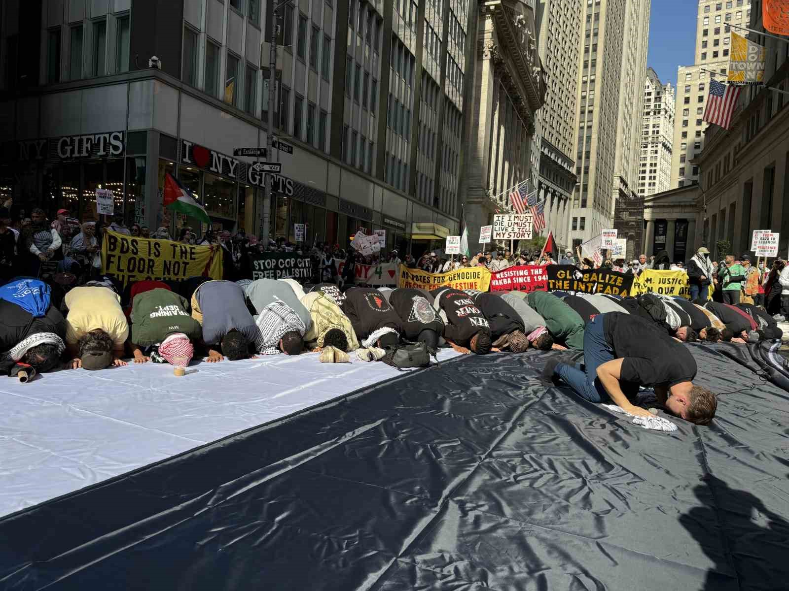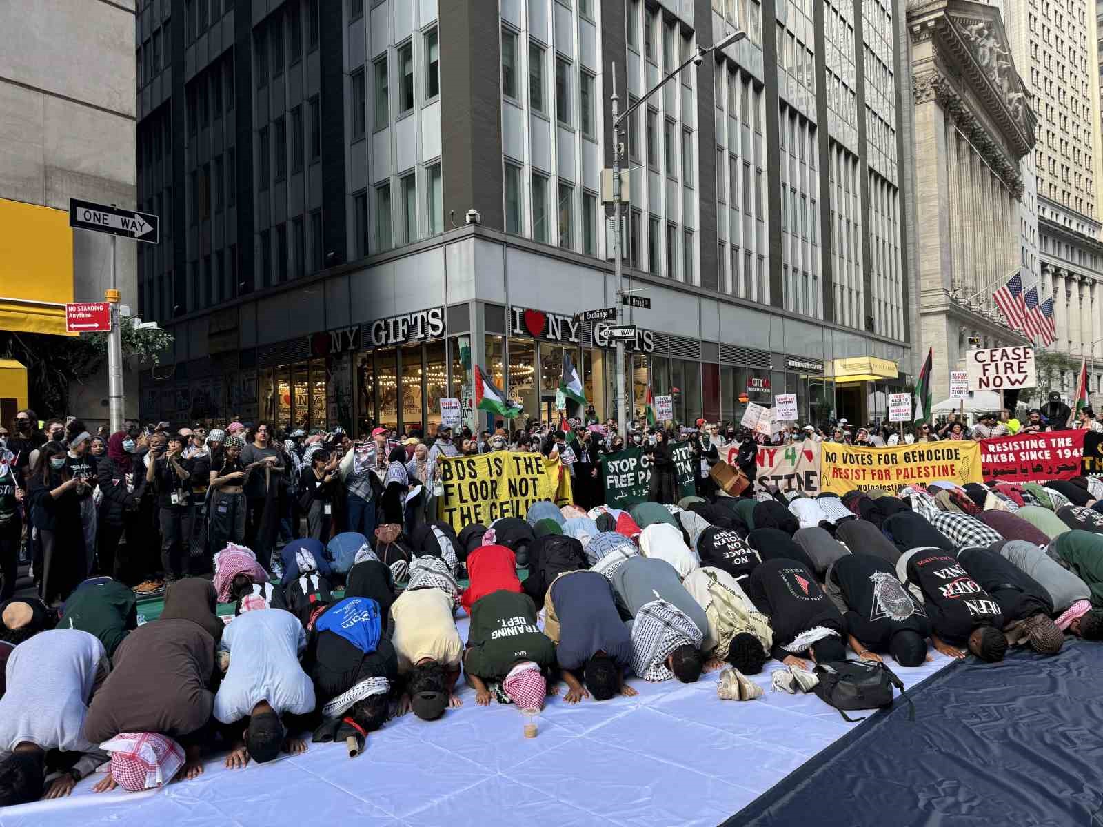 Filistin yanlısı protestocular öğlen namazı saatinde Wall Street’te ezan okuyup, toplu namaz kıldılar. Bu esnada İsrailli karşıt grup, sloganlar atarak namaz kılan gruba müdahale etmeye çalıştı.