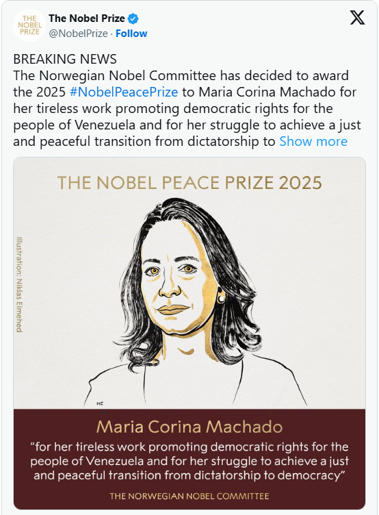 Norveç Nobel Komitesi, bu yılın en prestijli ama çoğu zaman öngörülmesi zor ödüllerinden biri olan Nobel Barış Ödülü’nün Venezuelalı muhalif lider Maria Corina Machado’ya verildiğini açıkladı.