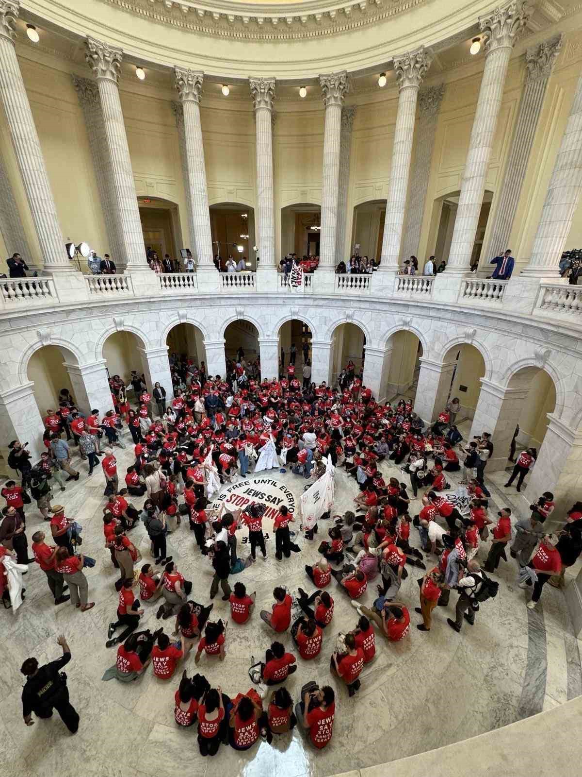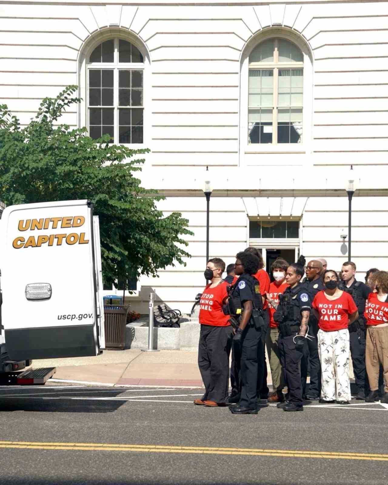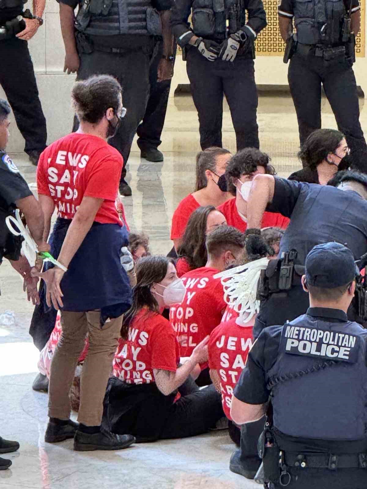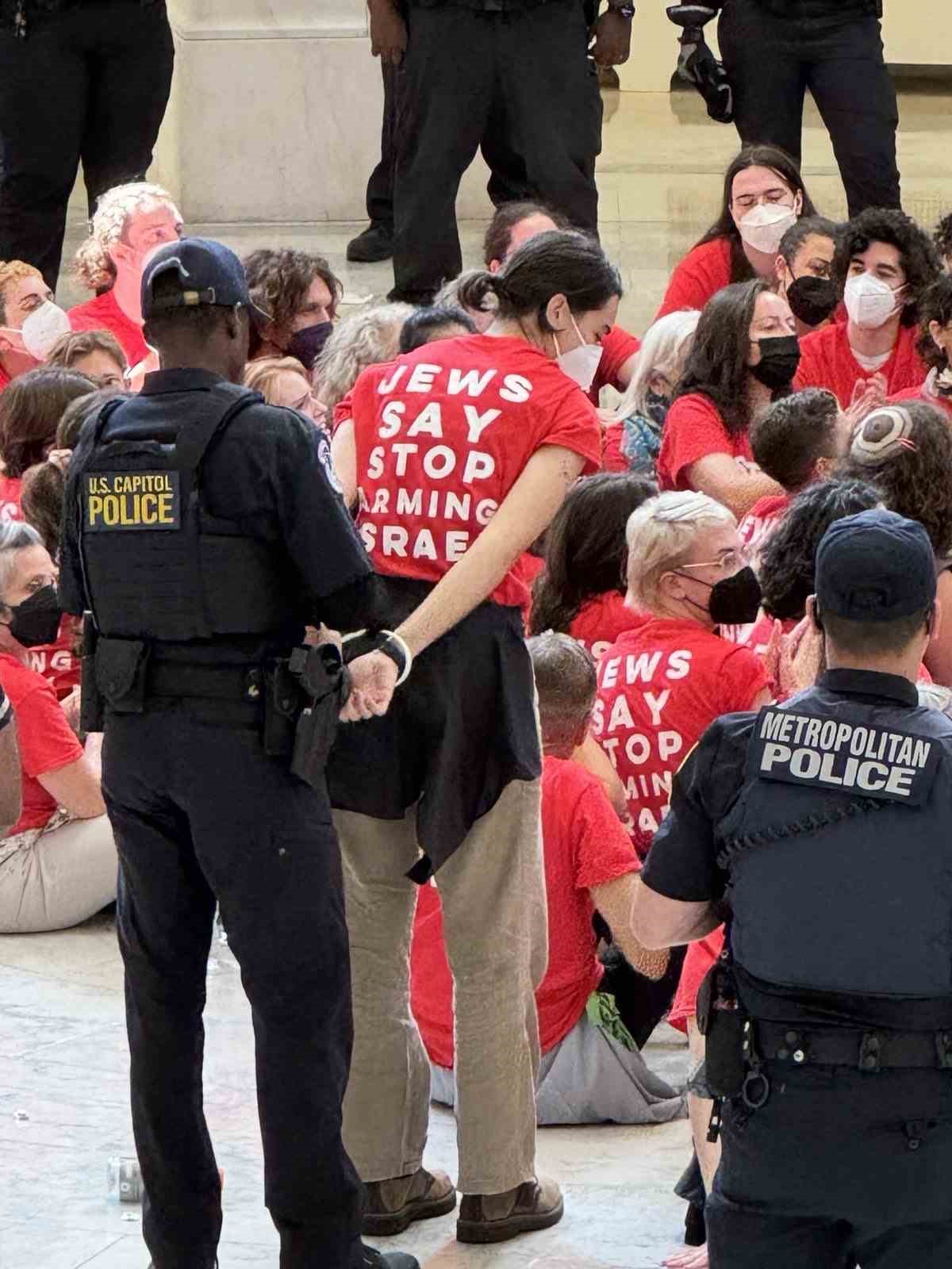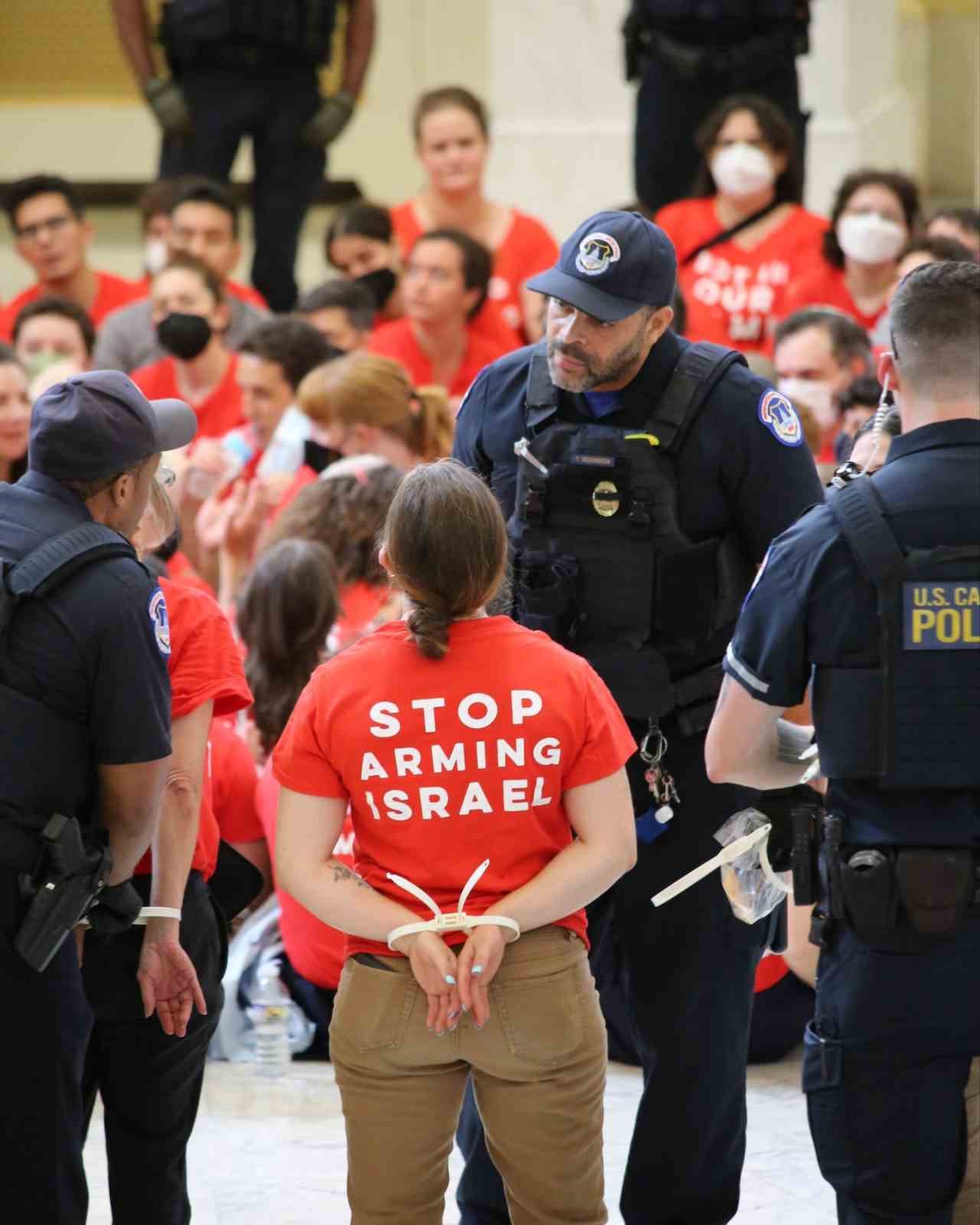 Polisin barışçıl gösteriyi sonlandırma çağrısına uymayan grubun üyeleri plastik kelepçe takılarak gözaltına alınırken, Capitol Polisi’nden yapılan açıklamada gösterinin “yasadışı” olduğu belirtildi. Açıklamada “Kongre binalarında gösteri yapılmasına izin verilmiyor. Yasal olarak içeri girenlere gösteriyi sonlandırmalarını, yoksa tutuklanacaklarını söyledik. Durmadılar, biz de onları tutukluyoruz” ifadeleri kullanıldı. Gözaltı sayısına dair kesin bilgi verilmezken, JVP’den yapılan açıklamada ise 300’ü aşkın göstericinin gözaltına alındığı belirtildi.