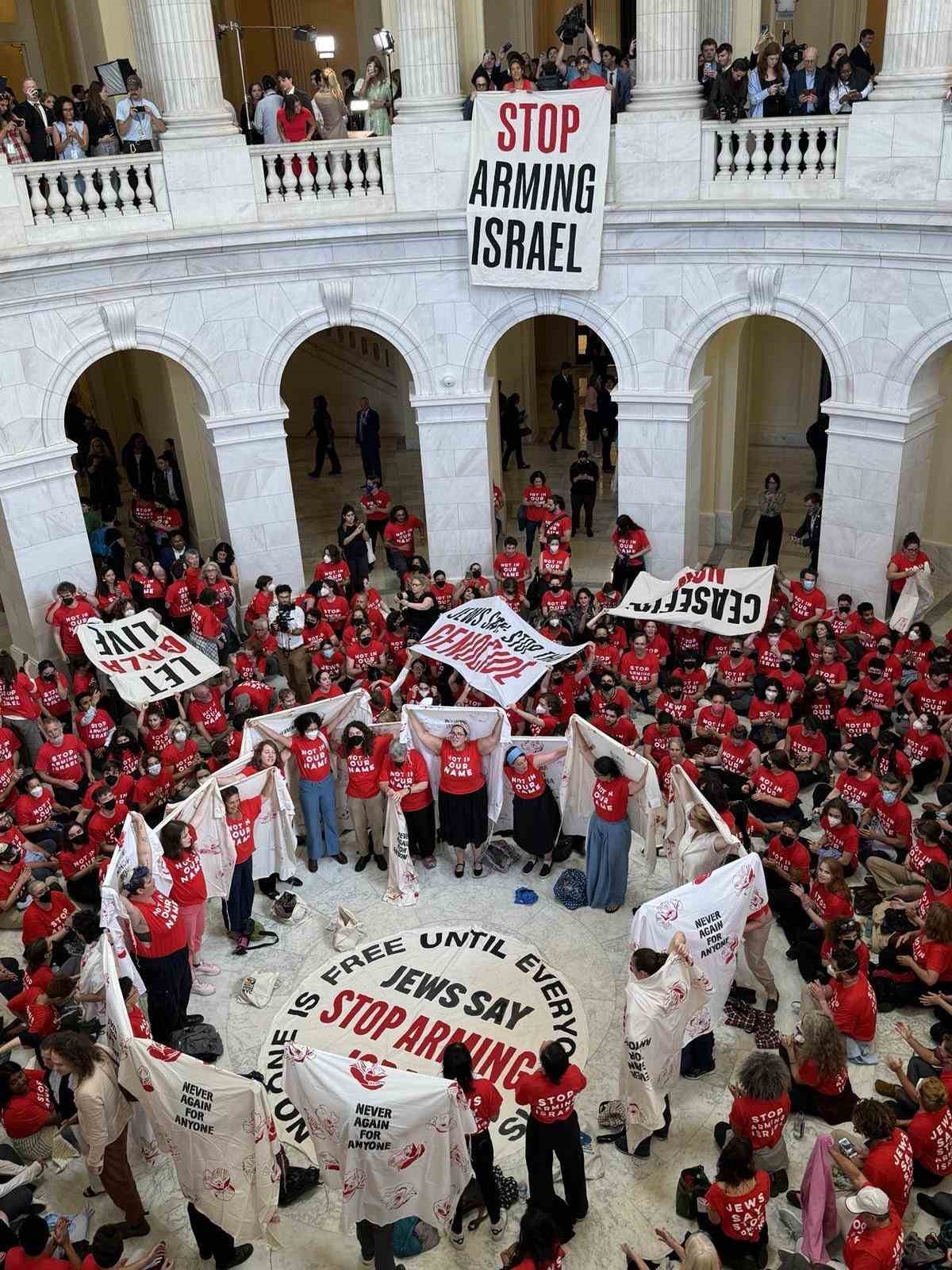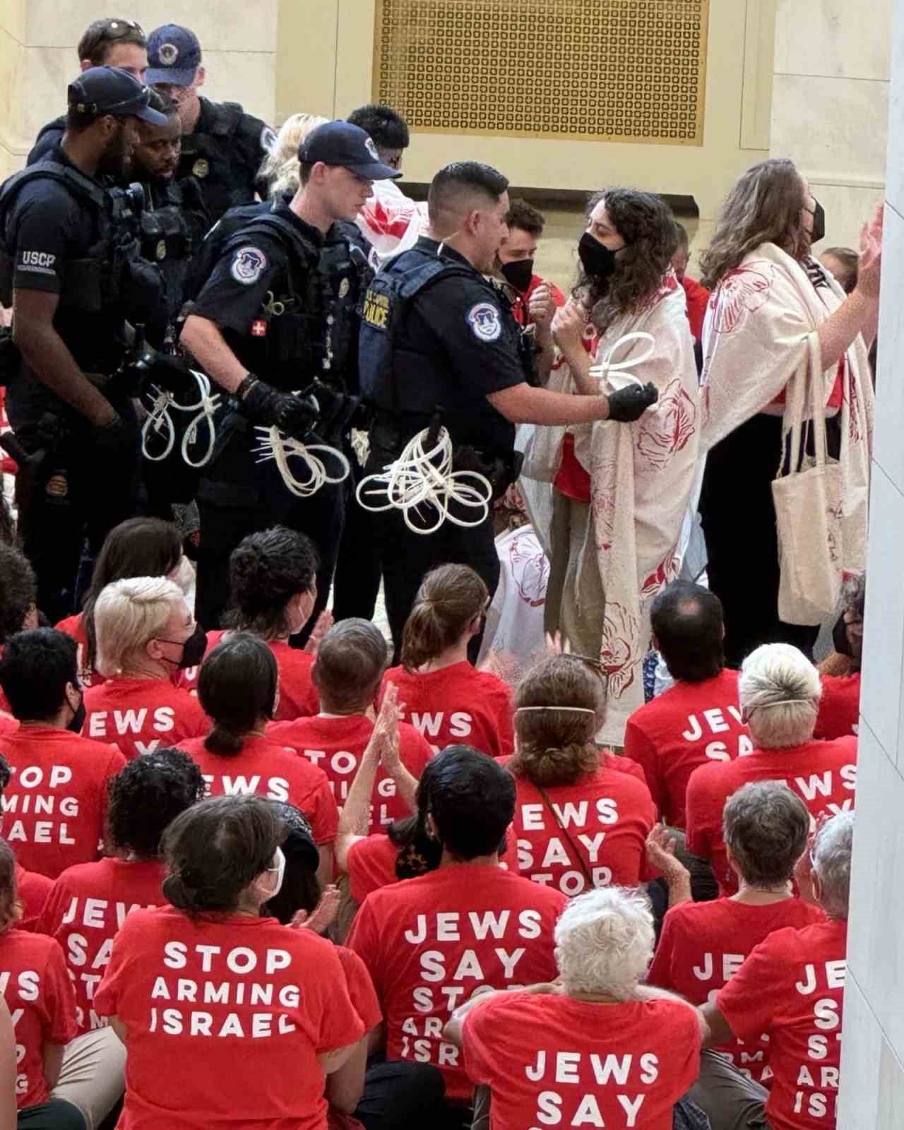 İsrail’in Filistinlilere yönelik saldırılarına tepki gösteren savaş karşıtı Yahudi göstericiler, ABD Kongresi’nde protesto gösterisi düzenledi. ABD hükümetine İsrail’e silah desteğini durdurma çağrısı yapan göstericiler polis tarafından gözaltına alındı.