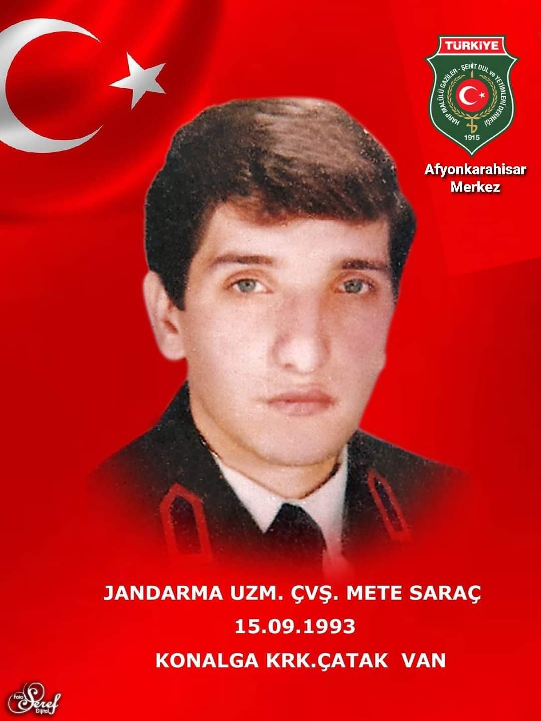 1993 yılında Van Çatak kırsalında silâhlı çatışma sonucu şehit olan Afyonkarahisarlı şehit Uzm.J.Çvş. Mete Saraç’ın babası Mehmet Saraç, tedavi gördüğü AFSÜ Araştırma Hastanesinde yaşlılığa bağlı sebeplerden dolayı hayata gözlerini yumdu. Şehit babası için Paşa Camii’nde cenaze töreni düzenlendi. Cenaze töreni ve namazına İkmal ve Garnizon Komutanı Vekili P.Kd.Alb. Ahmet Özdemir, İl Jandarma Komutan Yardımcısı J.Alb. Akif Yorulmaz, Önceki Dönem Afyonkarahisar İl Genel Meclisi Başkanı Burhanettin Çoban, Aile ve Sosyal Hizmetler İl Müdürü Bilal Erdoğan, Türkiye Harp Malulü Gaziler Şehit Dul ve Yetimleri Derneği Afyonkarahisar Şube Başkanı Malül Gazi İsmail Kumartaşlı, asker ve sivil vatandaşlar ile şehit ve gazi yakınları katıldı. Kılınan cenaze namazının ardından şehit babası Mehmet Saraç, dualarla ebediyete uğurlandı. 1993 yılında Van Çatak kırsalında gerçekleşen silahlı çatışmada şehit olan kahraman askerin babası, Afyonkarahisar halkı tarafından sevilip sayılan bir kişi olarak biliniyordu.>>>Yunus Üstündağ