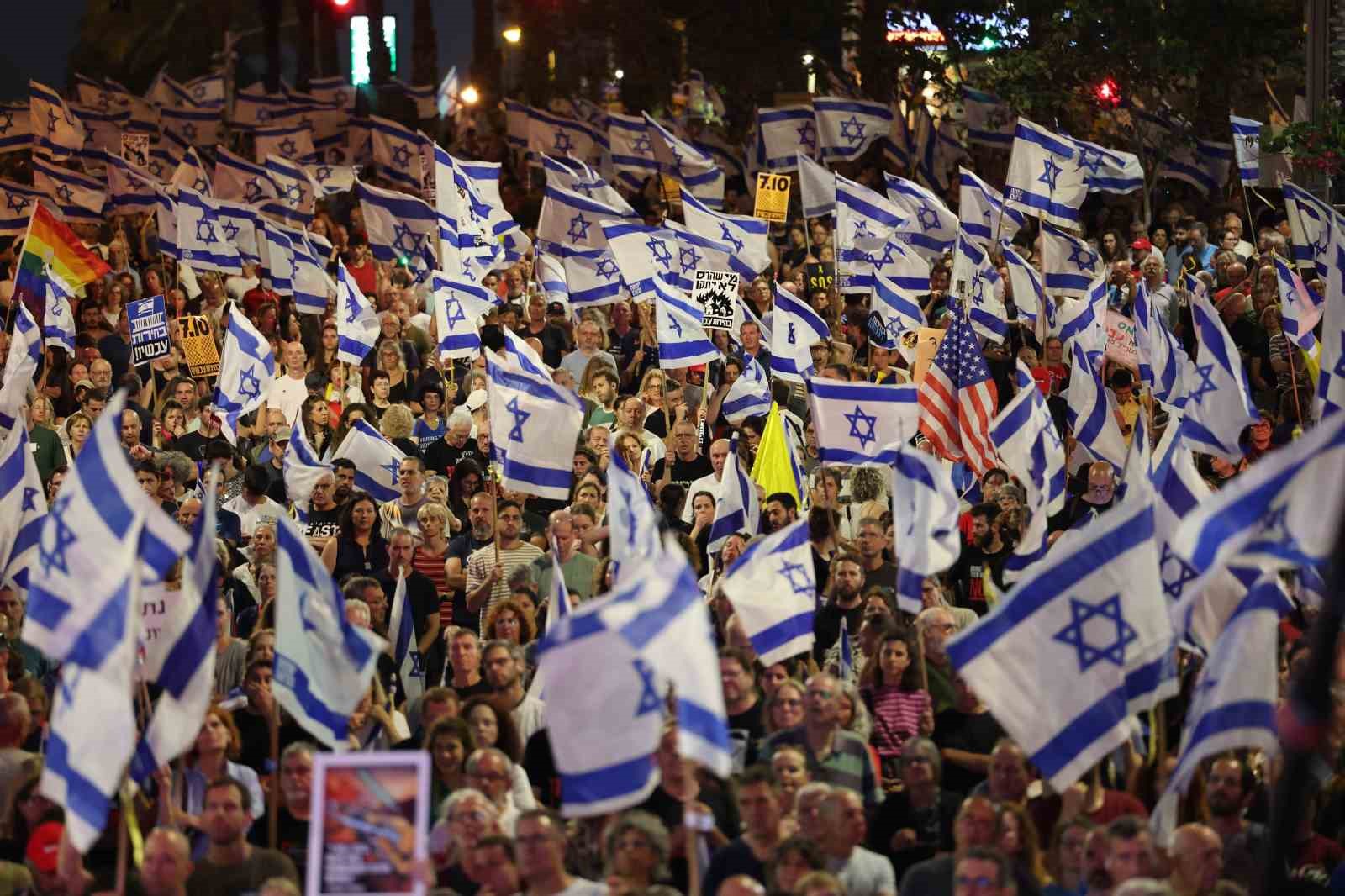 İsrail’in başkenti Tel Aviv’de yaklaşık 120 bin kişinin katılımıyla İsrail’in Gazze’ye yönelik saldırılarına başladığı 7 Ekim’den bu yana en büyük hükümet karşıtı protesto gerçekleştirildi.