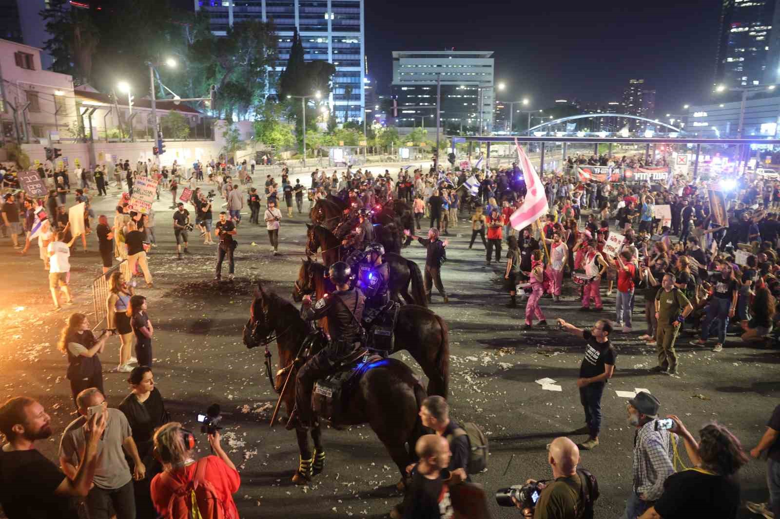İsrail’in başkenti Tel Aviv’de Başbakan Binyamin Netanyahu hükümeti karşıtı eylemler devam ediyor. Binlerce kişi Tel Aviv sokaklarına akın etti. Hükümet karşıtı slogan atan eylemciler, rehinelerin serbest bırakılması için bir anlaşma yapılması ve Netanyahu’nun görevden alınarak erken seçimlere gidilmesi çağrısında bulundu. Tel Aviv’deki Demokrasi Meydanı’nda ateş yaktan protestocular ile göstericileri dağıtmak isteyen polis arasında arbede yaşandı. Polis ile göstericiler arasında tansiyonun yükseldiği eylemde aralarında Tel Aviv Emniyet Müdür Yardımcısı Başkomiser Avi Ofer’in de bulunduğu 14 polis yaralandı. Polis, eylemcilere tazyikli su sıkarken 2 gösterici de gözaltına alındı.