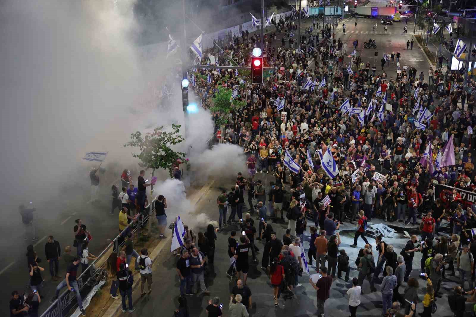 Tel Aviv’deki Begin Caddesi’ni trafiğe kapatan göstericiler, yolda ateş yaktı. Polis ile göstericiler arasında arbede çıktı.