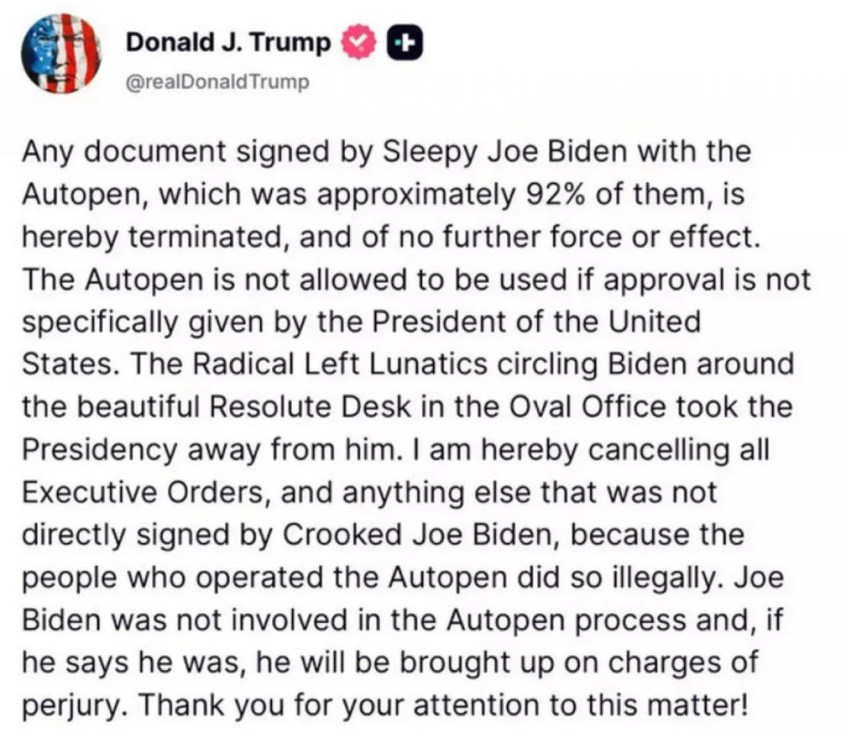 Trump açıklamasında, “Uykucu Joe Biden” tarafından imzalanan belgelerin yaklaşık yüzde 92’sinin otomatik imza cihazıyla atıldığını iddia ederek, “Bundan böyle geçersizdir, hiçbir hukuki etkisi yoktur” dedi. Eski Başkan, Autopen cihazının Başkan’ın açık ve özel onayı olmadan kullanılamayacağını belirtti.