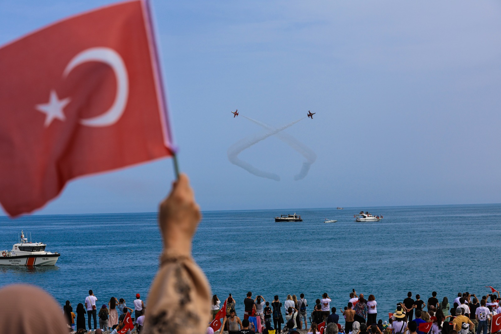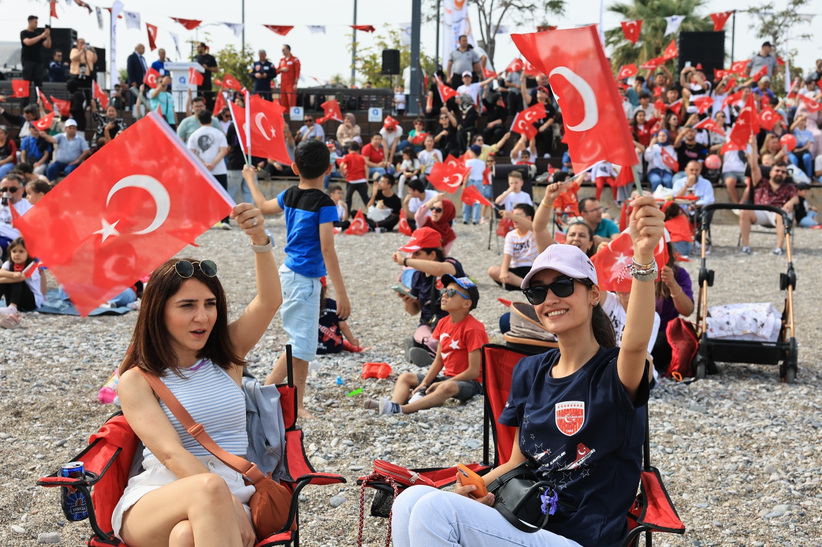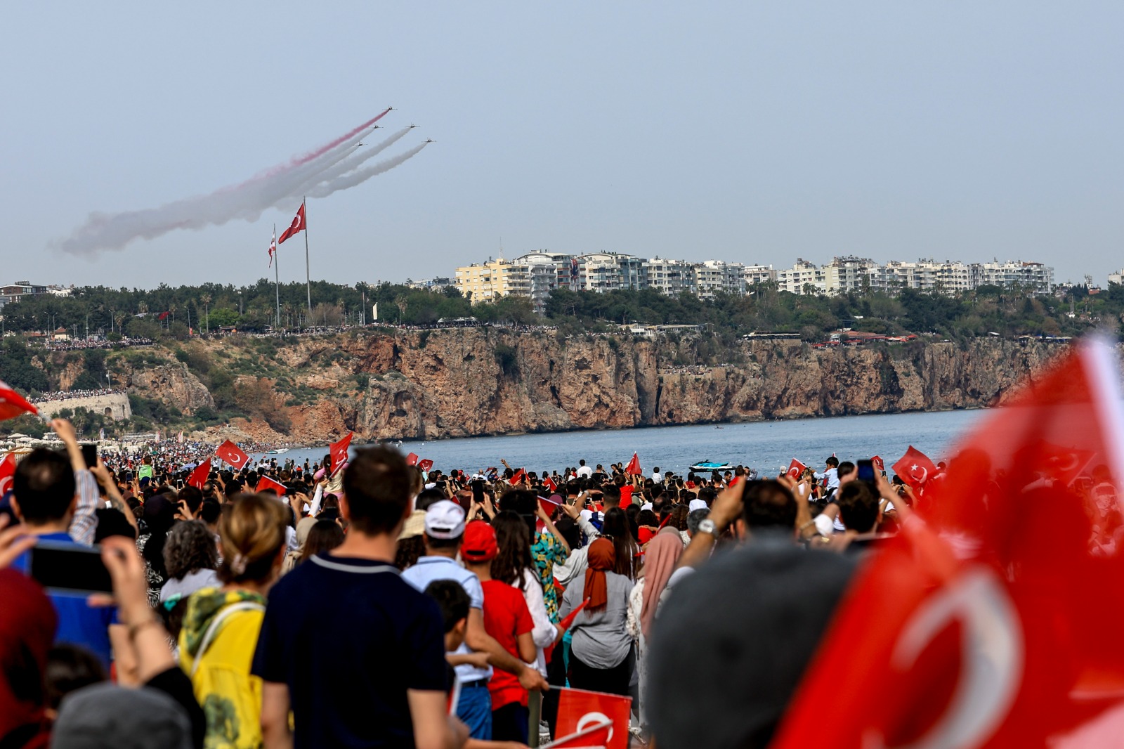 Türk Hava Kuvvetleri’ne bağlı akrobasi timi Türk Yıldızları, 23 Nisan Ulusal Egemenlik ve Çocuk Bayramı’nda Antalya semalarında gösteri uçuşu gerçekleştirdi. Konyaaltı Sahili’nde gerçekleştirilen gösteri uçuşunu izlemek isteyen on binlerce vatandaş sahil bandına akın etti. Konyaaltı Sahili hınca hınç insanla dolarken, iğne atsan yere düşmez denilen görüntüler yaşandı. Vatandaşların 23 Nisan Ulusal Egemenlik ve Çocuk Bayramı coşkusu, Türk Yıldızlarının muhteşem gösterisinde zirveye çıktı.