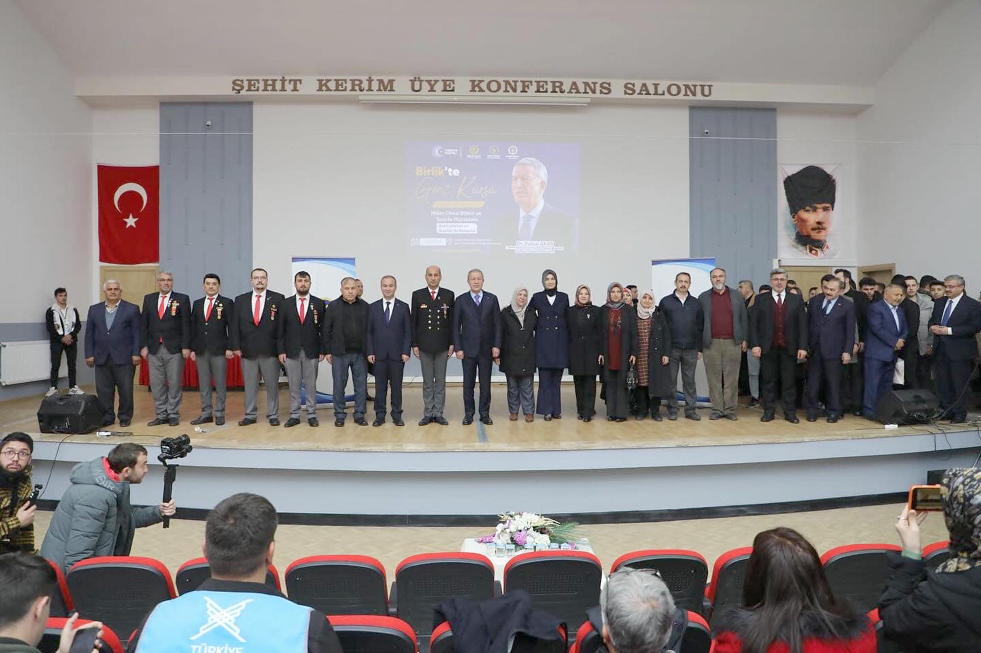 Akar, Türkiye’nin tarihiyle, değerleriyle, coğrafyasıyla, genç nüfusuyla, etkin, caydırıcı ve saygın ordusuyla gerçekten büyük bir ülke olduğunun altını çizdi. Mehmetçiğin kahraman, fedakar, cesur ve metin olduğunu anımsatan Akar, “Yüksek teknolojiye dayalı araç, gereç, silah ve mühimmat lazım. Bunun için de savunma sanayisi gerekli ve bu konuda bizim canımız çok yandı. Her gittiğimiz toplantıda bize paramızla İHA, SİHA, top, tüfek, helikopter, uçak ve tank verin dedik, alamadık. Parasını verdiklerimizi de alamadık. Kötü komşu ev sahibi yapar. Çok şükür, bu konuda direttik ve çalıştık. Üniversitelerimiz, özel sektör ve kamu omuz omuza verdiler. Allah’a çok şükür şu anda silahlı kuvvetlerin ihtiyaçlarının yüzde 80’ini karşılıyorlar. Bunları dost ve müttefiklerimize de ihraç ediyoruz. Bu noktaya geldik. Onların ihtiyaçlarını da karşılıyoruz. Şuanda milli muharip uçağımız Kaan’ı da uçurduk, uçuracağız. Az kaldı. Dolayısıyla İHA’sıyla, SİHA’sıyla, silahlı helikopteriyle, ANKA’sıyla, Kızılelma’sıyla ve TİHA’sıyla Türkiye artık bir bütün halinde savunma sanayinde söz sahibi oldu.” Programda, Afyonkarahisar Valisi Kübra Güran Yiğitbaşı ile Birlik Vakfı Afyonkarahisar Şube Başkanı Eyüp Aksoy da konuşma yaptı. Konferansın sonunda Akar’a plaket takdim edildi.>>>AA