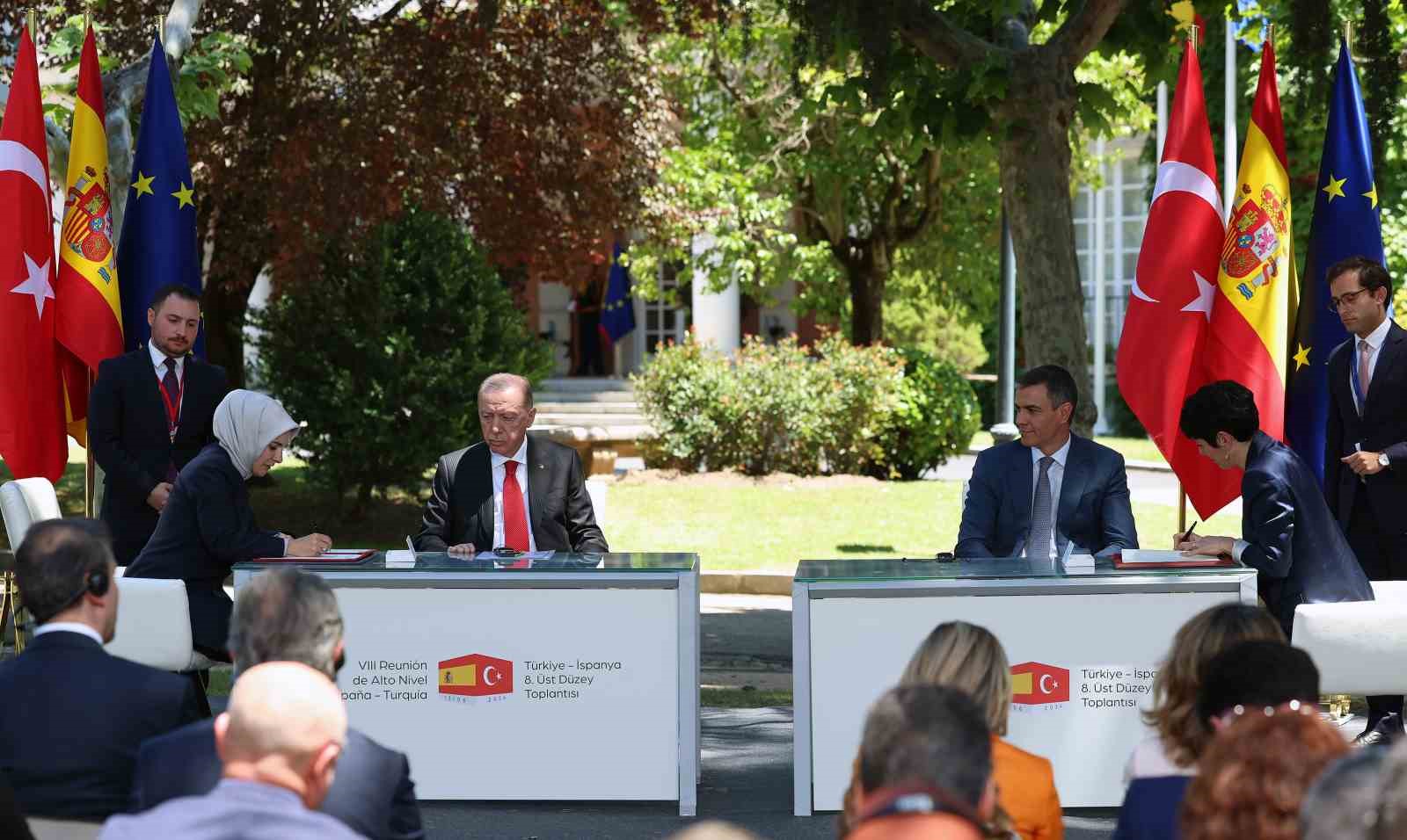 Cumhurbaşkanı Recep Tayyip Erdoğan İspanya temaslarını sürdürüyor. Başkent Madrid’de Erdoğan ile Sanchez arasındaki gerçekleştirilen ikili ve heyetlerarası görüşmenin ardından anlaşmaların imza törenine geçildi. Törende, Cumhurbaşkanı Erdoğan ve Başbakan Sanchez huzurunda 11 belge imzalandı.