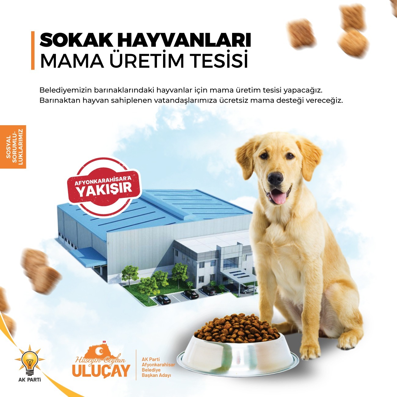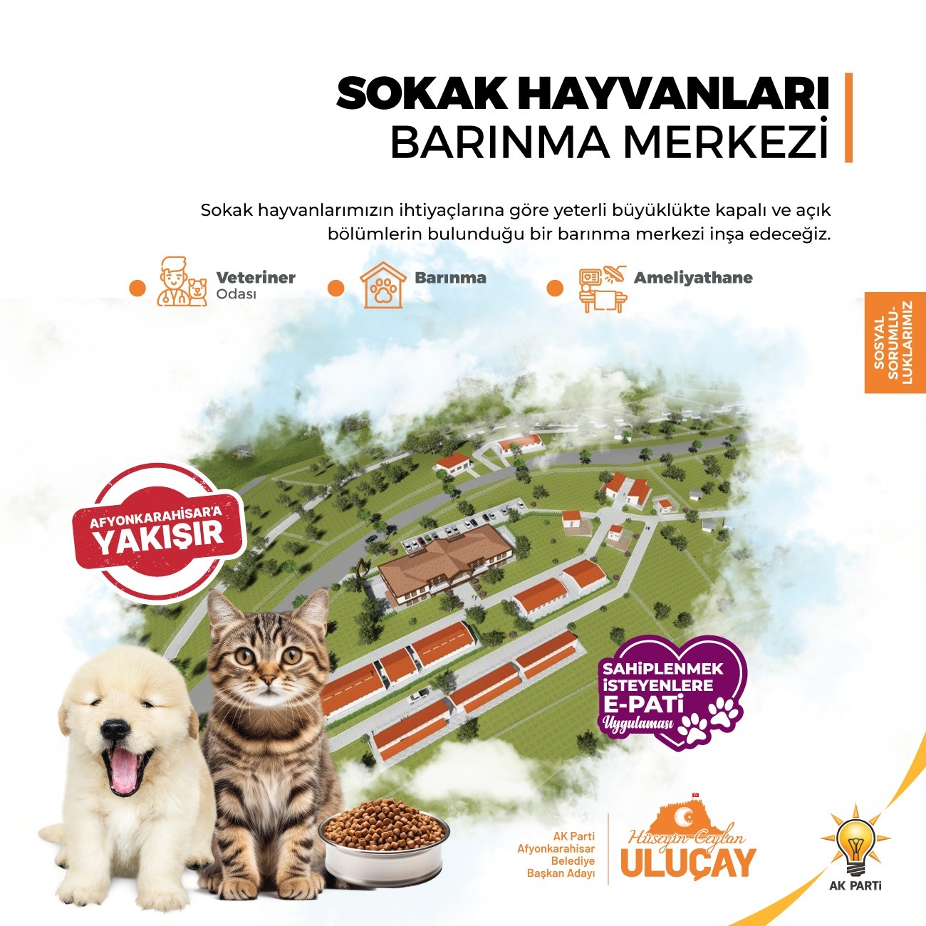 AK Parti Afyonkarahisar Belediye Başkan Adayı Hüseyin Ceylan Uluçay gerçekleştireceği projeleri arasında yer alan ‘Sokak Hayvanları Barınma Merkezi’ ve ‘Sokak Hayvanları Mama Üretim Tesisi’ projeleri hakkında açıklamada bulundu.