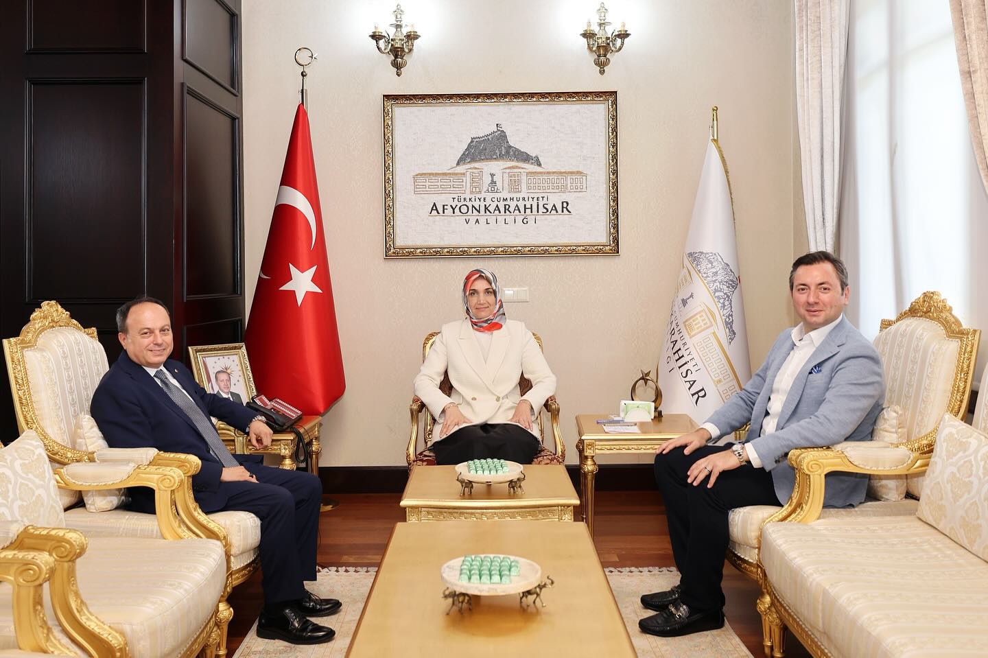 Afyonkarahisar’ın ekonomik gelişimine katkı sağlayan isimlerden Afyonkarahisar Ticaret ve Sanayi Odası (ATSO) Yönetim Kurulu Başkanı Hüsnü Serteser ile TOBB Türkiye Fuarcılık Sektör Meclisi Başkanı Cihat Alagöz de Vali Yiğitbaşı’nı makamında ziyaret etti. Görüşmede ildeki fuarcılık faaliyetlerinin geliştirilmesi ve yerel ekonomiye katkı sağlayacak projeler masaya yatırıldı.