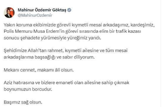 Bakan Göktaş, sosyal medya hesabından yaptığı açıklamada, “Yakın koruma ekibimizde görevli kıymetli mesai arkadaşımız, kardeşimiz, polis memuru Musa Erdem’in görevi sırasında elim bir trafik kazası sonucu şehadete yürümesiyle yüreğimiz yandı.” ifadesini kullandı.
