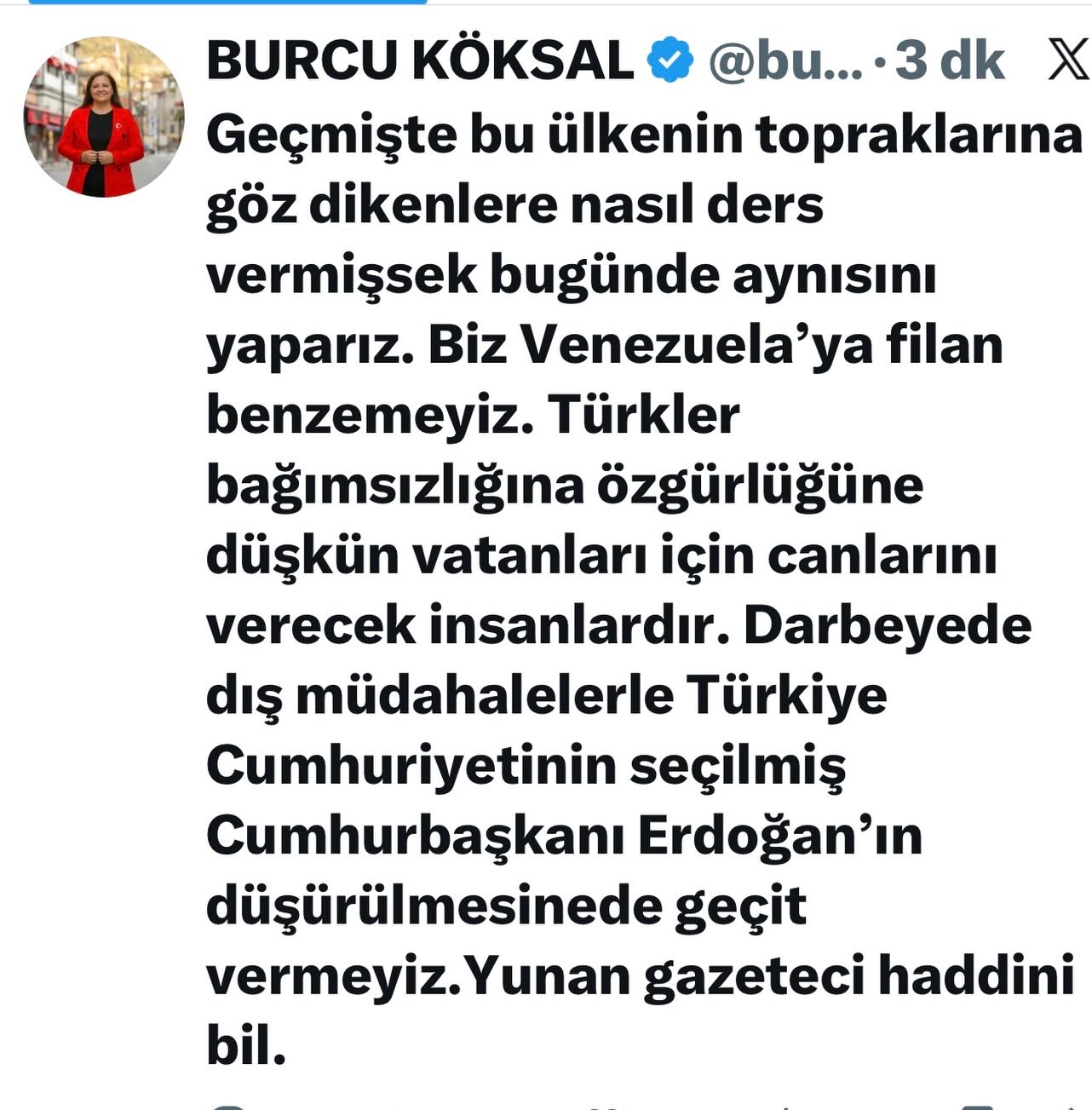 Başkan Köksal, sosyal medya hesabından bir paylaşım yaparak, Türkiye’nin bağımsızlığına ve demokratik iradesine yönelik her türlü dış müdahaleye karşı net ve sert bir duruş sergiledi. Başkan Köksal, Türkiye’nin tarih boyunca bağımsızlığına sahip çıkan bir millet olduğunu vurgulayarak, ülkenin başka devletlerle ya da senaryolarla kıyaslanamayacağını ifade etti. Başkan Köksal, paylaşımında şu ifadelere yer verdi: “Geçmişte bu ülkenin topraklarına göz dikenlere nasıl ders vermişsek bugün de aynısını yaparız. Biz Venezuela’ya filan benzemeyiz. Türkler bağımsızlığına, özgürlüğüne düşkün, vatanları için canlarını verecek insanlardır. Darbeye de dış müdahalelerle Türkiye Cumhuriyeti’nin seçilmiş Cumhurbaşkanı Erdoğan’ın düşürülmesine de geçit vermeyiz. Yunan gazeteci haddini bil.” >>>Haber Merkezi