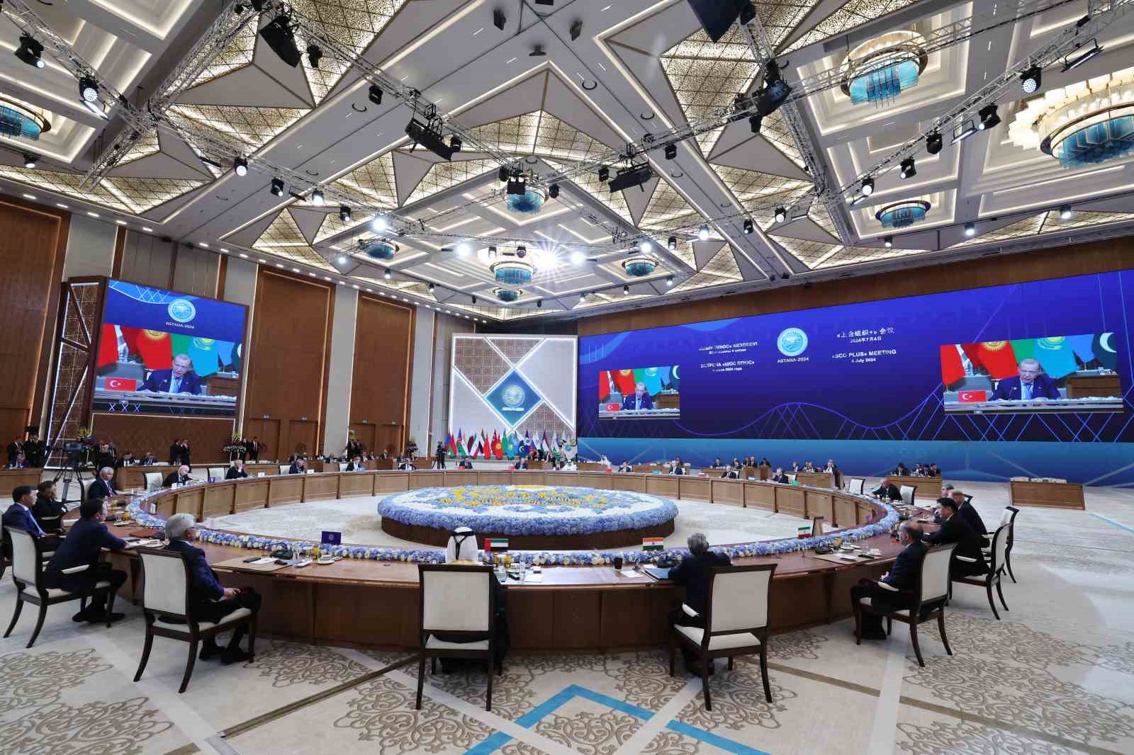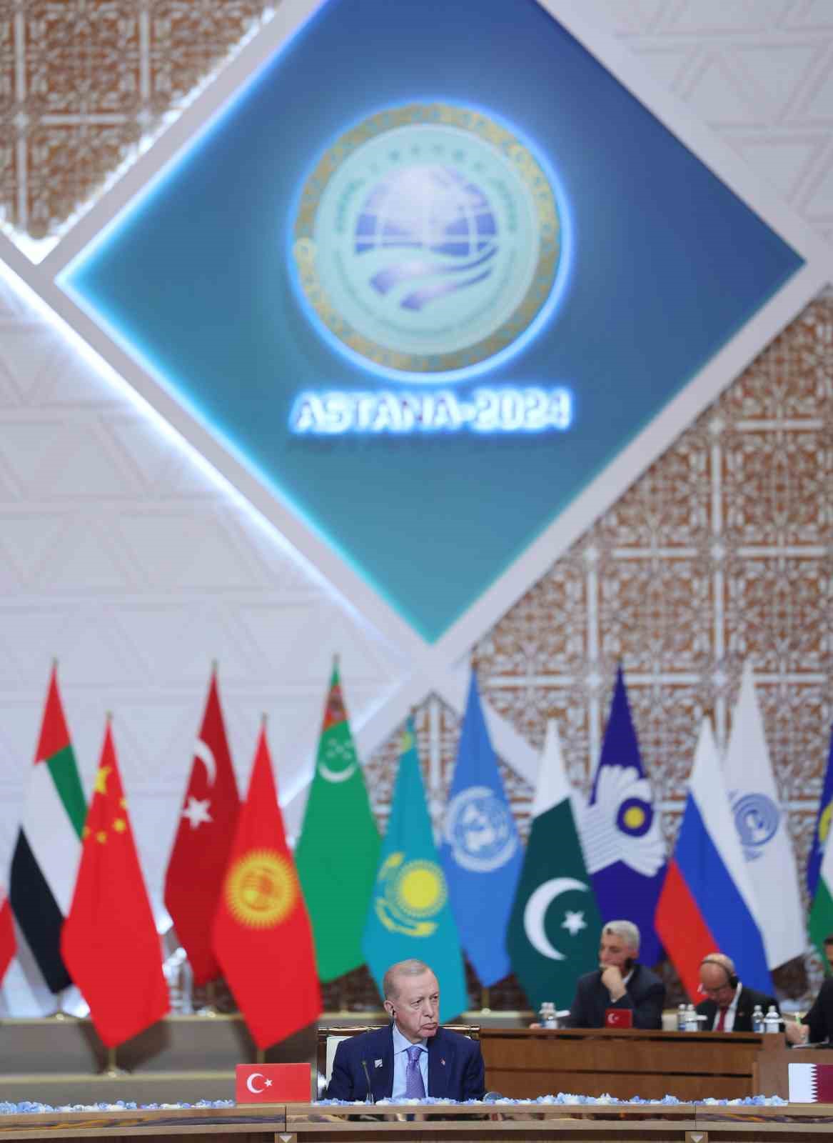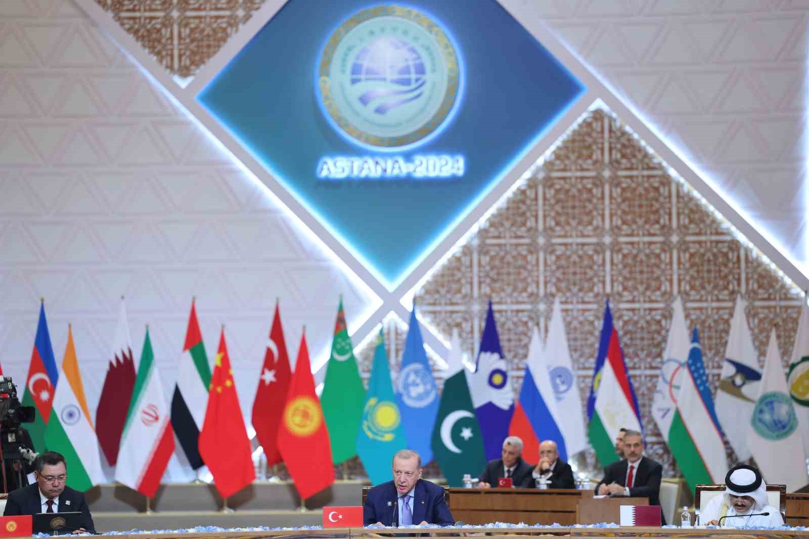 Cumhurbaşkanı Recep Tayyip Erdoğan, Bağımsızlık Sarayı’nda düzenlenen Şanghay İşbirliği Örgütü (ŞİÖ) 24’üncü Devlet Başkanları Zirvesi Genişletilmiş Oturumu’nda konuştu. Zirveye katılmaktan duyduğu memnuniyeti dile getiren Cumhurbaşkanı Erdoğan, Kazakistan Cumhurbaşkanı Kasım Cömert Tokayev’e daveti için teşekkür etti. Cumhurbaşkanı Erdoğan, ŞİÖ üyeliğine yeni kabul edilen Belarus’u ve Ocak 2025 itibariyle ŞİÖ Genel Sekreterliğini üstlenecek Nurlan Yermekbayev’i de kutladı.