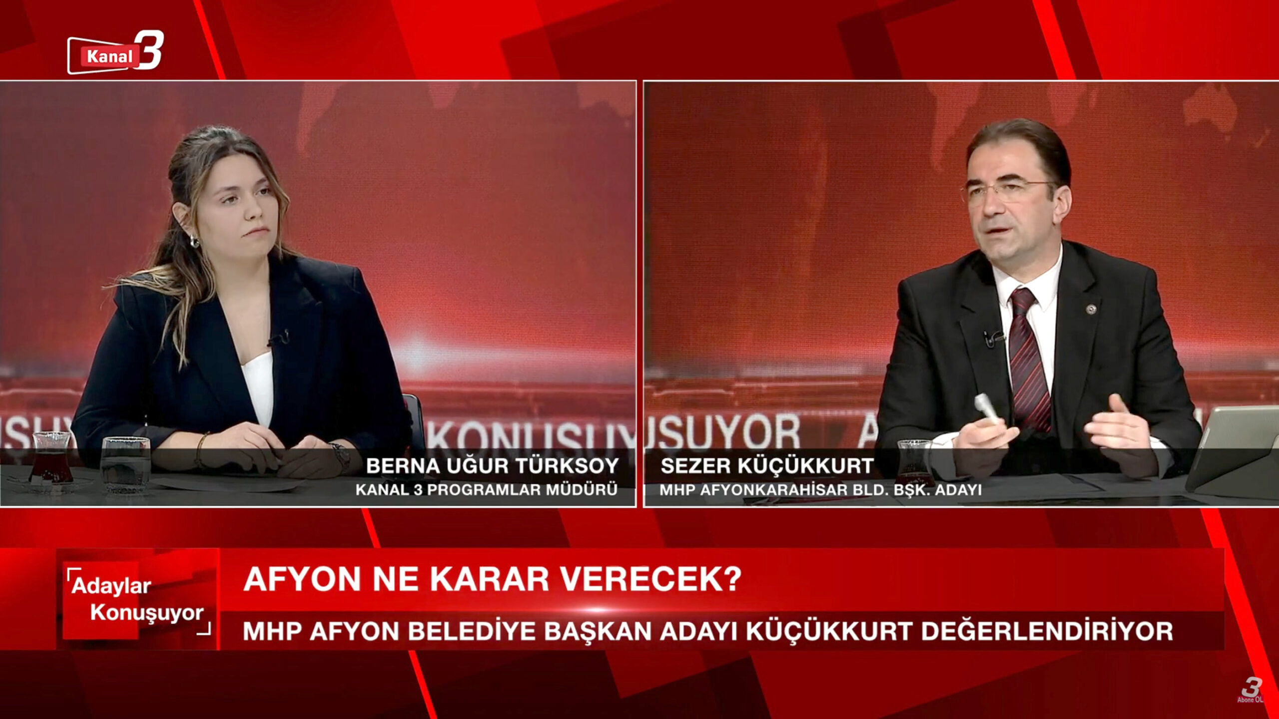 Kanal3’te Programlar Müdürü Berna Uğur Türksoy’un sunduğu Adaylar Konuşuyor programına konuk olan MHP Afyonkarahisar Belediye Başkan Adayı Sezer Küçükkurt, yaptığı açıklamada, “Hemşerilerimizden de son derece olumlu bir tepki alıyoruz yerel yönetim bazında mutlaka bir değişim gerçekleşmesinden yanalar” dedi.